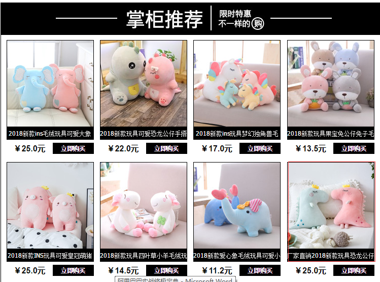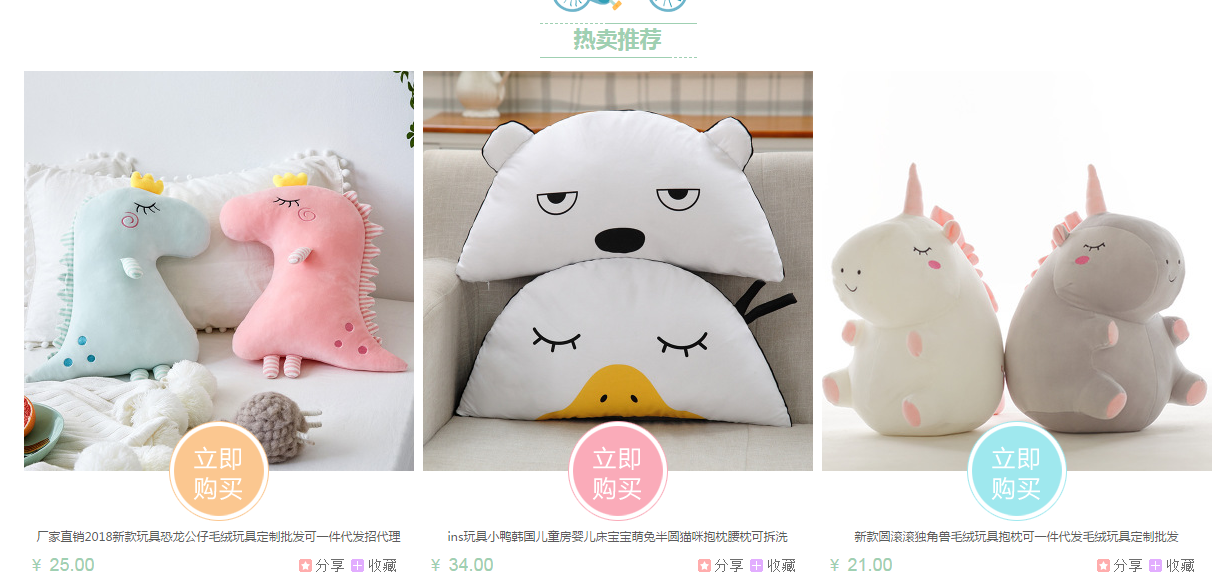 图11-13是店铺打造爆款的流程,但这里还有一个重要细节就是:首页承接。这个就是规划和布局的问题,正确的布局应该是集中优势兵力:轮播图里面必须放爆款,热卖里必须放爆款,详情里面必须放爆款,关联营销里必须放爆款。首先,搜索“毛绒玩具”后在首页出现主图及标题等内容,如图11-14所示。