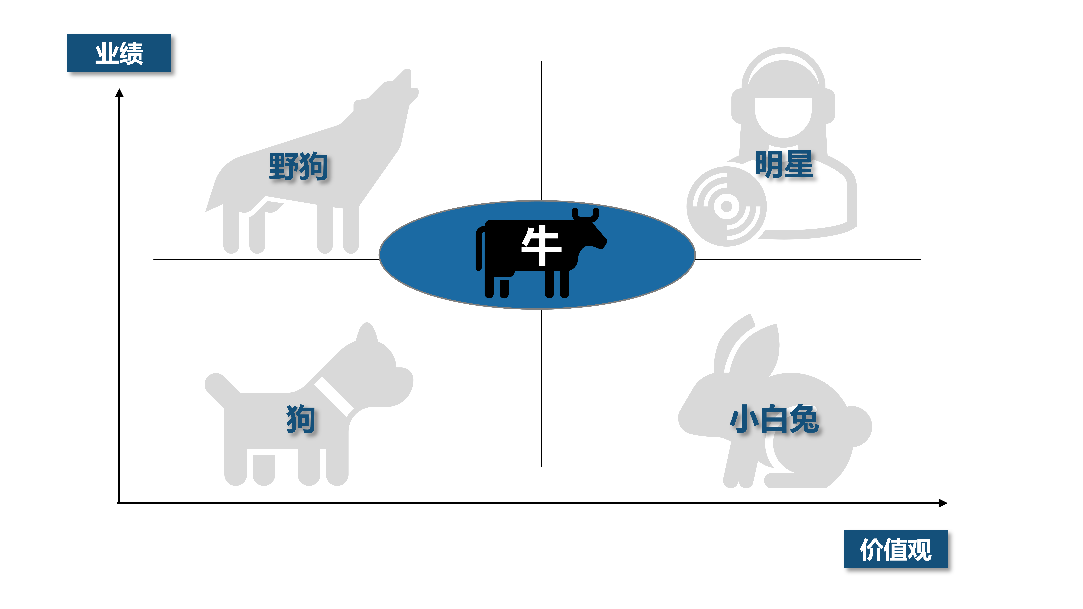 第五类:业绩一般价值观也一般的被称作“牛”,这样的员工占大多数,他们一般随大流,小白兔得势就跟着变成小白兔,明星得势了这些人就会学习明星,这是团队中的大多数。3
