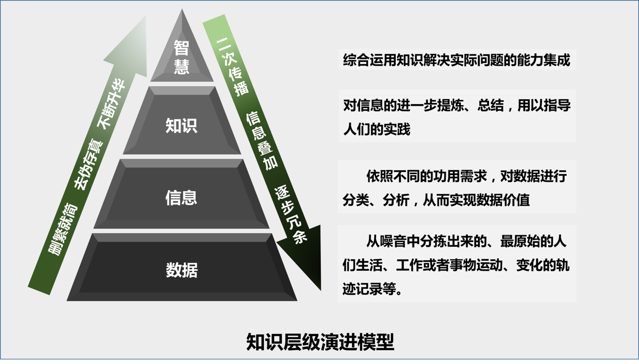 但是,在人们的经验性认知中,信息很显然并不等同于知识——“知识的五种演进层次,可以双向演进。从噪音中分拣出来数据转化为信息,升级为知识,升华为智慧。这个过程是信息的管理和分类过程,让信息从庞大无序到分类有序、各取所需。这就是一个知识管理的过程,也是一个让信息价值升华的过程。”所以,关于知识的层级演进可以用图8-7表示。
