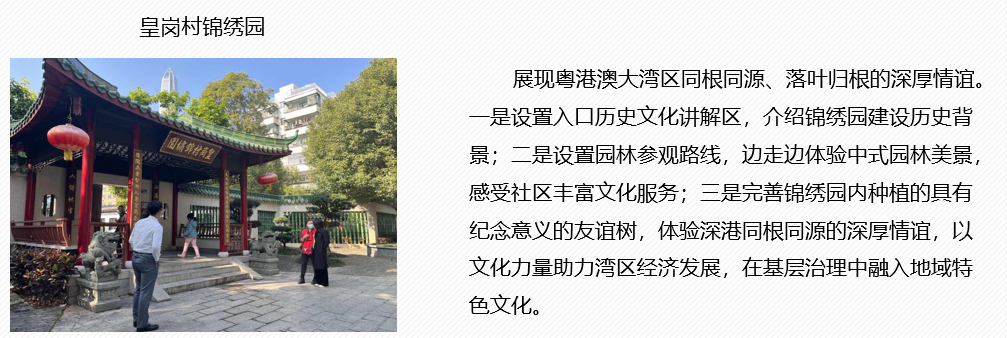 皇岗社区曾荣获“全国社区侨务工作明星社区”国家级荣誉称号,以高质量、高标准、便捷化的公共服务提升深港两地居民生活幸福感、获得感,持续增进深港友谊,助力粤港澳大湾区经济文化发展。通过深港便民服务点、锦绣园深港友谊体验、皇岗老村建筑艺术和民俗风情体验和老人之家旧照片回顾展现皇岗村与港澳两地的深厚情谊,以公共文化力量促进基层治理与服务。