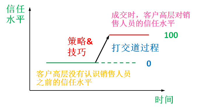 如图3-2所示,在销售人员没有与客户高层打交道前,他对于销售人员的信任就无从谈起,信任度就是0;通过与客户高层打交道,逐步积累、提升他对销售人员的信任,直至达到成交时所需要的信任度100(假设此时的信任度为100),客户高层才会决定采购销售人员所销售的产品。所以,销售人员与客户高层打交道的过程,实际上就是加深客户高层对销售人员信任的过程。