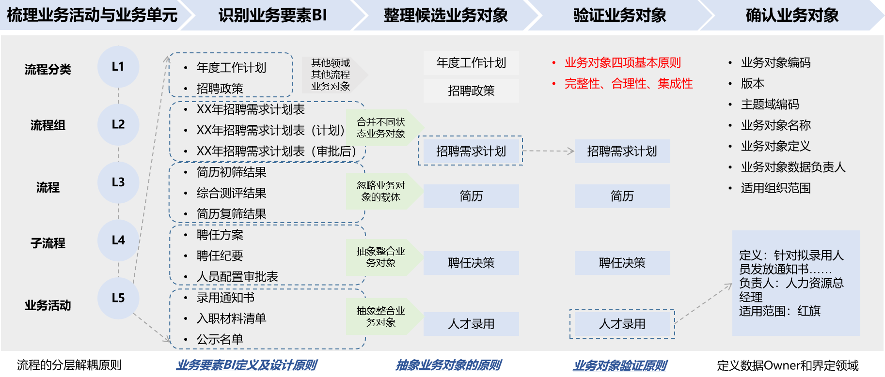 业务对象的确认包括梳理业务活动与业务单元、识别业务要素BI、整理候选业务对象、验证业务对象、确认业务对象5个步骤。以企业人才招聘业务活动的业务对象识别过程为例,见图3.16。