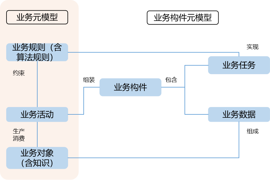 在业务对象、业务活动、业务规则均确认后,可开展对业务构件元模型的设计。业务构件元模型包括业务构件、业务任务、业务数据三个要素。其中,业务构件作为业务架构中构件设计的关键,由业务活动组装而成,是对业务行为和业务数据的封装;业务任务由业务规则转换而来,是实现业务预想结果所必须执行的一系列动作,可固化为一段操作过程、一个具体的操作动作或一连串软件行为;业务数据由业务对象组成,是对业务对象状态以及业务任务执行过程与结果的描述。业务构件元模型是对架构核心概念要素的精准定义和统一语言描述,推动架构核心由知识层向行为层转换,在业务架构、信息架构、应用架构之间建立了更加直接的联系,业务构件元模型见图3.17。