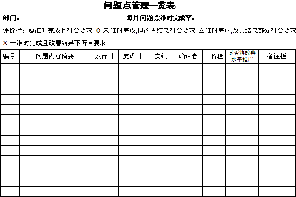 活动推进部门召集各部门负责人或主要活动成员深入各个管理部门和管理现场,找问题点,贴“问题票”。一旦发现某个地方存在需要加以改善的问题,就填写一张“问题票”贴在问题发生处。