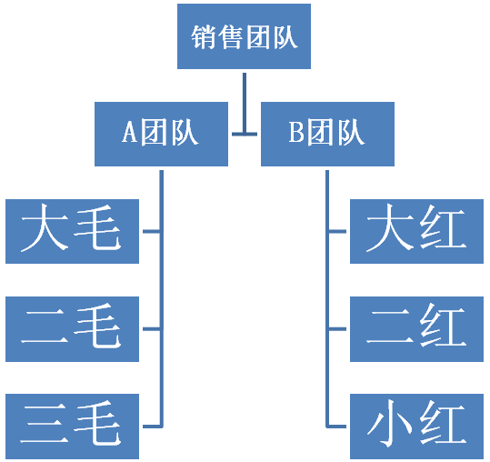 如图5-3所示,我们假设门店月度销售任务是100万元,给A、B两个销售团队下达的任务都是50万元,那么A、B两个团队的队长分别把任务分解到店员的头上。假设A团队的销售任务分解方案是大毛20万元、二毛20万元、三毛10万元;B团队队长的销售任务分解方案是大红20万元、二红20万元、小红10万元。那么,现在考核的问题来了。