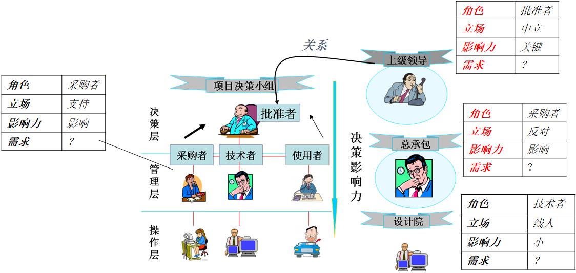 前面几讲我们从5个维度:决策流程、成员角色、立场、内部政治、影响力详细分析了项目的采购组织。如果销售人员能够画出项目五维图,如图4-4所示,说明他对项目是了解的。项目关键决策点;甲方各个部门、总承包、设计、招标公司等每个单位和个人的角色;他们的立场是怎么样的?他们的影响力?谁是关键人?关键人和决策人的需求;采购组织内部关系。对大一些的项目,都要有这张图来分析和讨论,随着分析越发深入,你的思路逐渐清晰,项目销售的策略方法也就形成了。