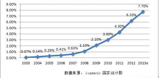图1-3 中国历年网上零售占社会总体零售的比例