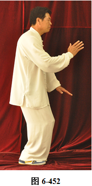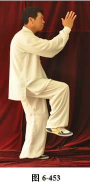 右金鸡独立:接上式,右腰下沉, 右脚向右前方落步,右手里翻下落按于右胯侧;左腰上提,左腿屈膝上提,左手向前上方划弧挑起,重心单落于右腿。身体直立,眼神注视前方(见图6-454)。