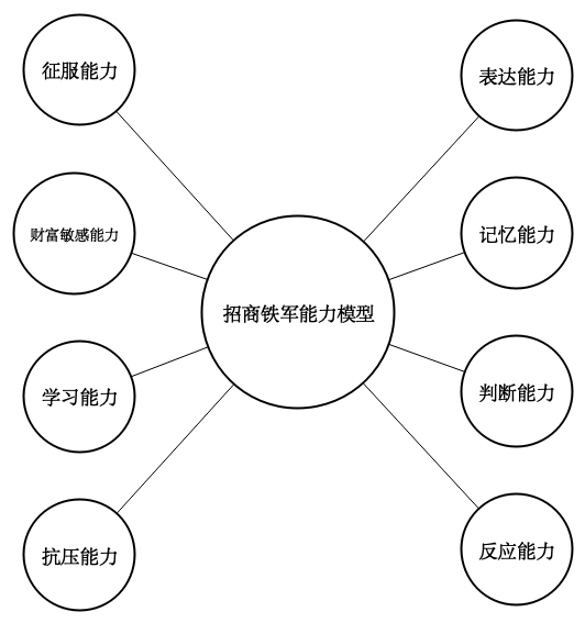 这是招商“铁军”核心的素质模型部分,作为岗位胜任能力模型,包括表达能力、记忆能力、判断能力、反应能力、抗压能力、学习能力、财富敏感能力、征服能力等8项能力素质指标,企业可以给8项指标设计分值,根据打分情况,对招商“铁军”团队成员进行销售能力的综合评估。