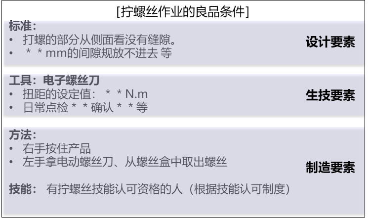 依据该工序质量特性、PFMEA、QC工程图、工艺文件、作业指导书、不良对策表等,制定该工序的良品条件。良品条件需要细分到每个作业步骤。