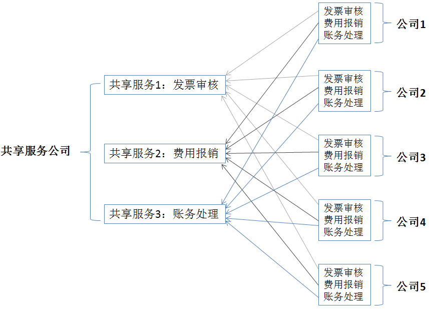 再如,有五家公司如公司1、公司2、公司3、公司4和公司5,原来都有发票审核作业、费用报销作业、账务处理作业,交易成本是很高的,工作效率是很低的。现在这五家公司均将发票审核作业、费用报销作业、账务处理作业分离出去;分离出去的相同作业合并为共享服务并组建共享服务公司,为原五家公司提供发票审核、费用报销、账务处理作业。原来每家公司处理自己一家公司的所有业务,现在共享服务中心的共享服务,处理所有公司的一类业务。这样,原五家公司的交易成本将大大降低,工作效率将大大提升;新成立的共享服务中心的共享服务也是更专业的,如图8-4所示。