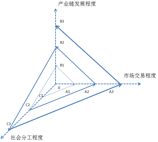 有三个坐标轴,分别是社会分工程度、市场交易程度和产业链发展程度,如图8-5所示。