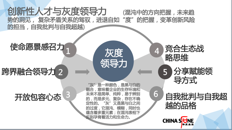 彭剑锋:新领导力就是灰度领导力。只不过跟前两年相比,因为环境的变化比较快速,对企业提出了新的要求,所以领导力的内涵有一些变化。现在要传达的是新领导力。