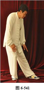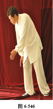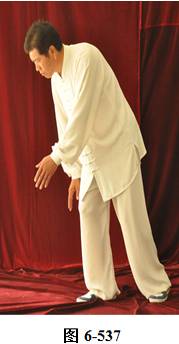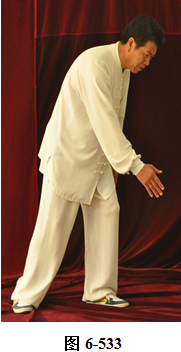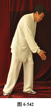 左云手:接上式,腰微拱,向左旋转。左脚以脚跟为轴向外转脚尖,脚尖转向东南。右脚以脚跟为轴向里转脚尖,脚尖转向东南。身体转向面朝东南;腰随即后拱,呈后倚坐式,重心落于右腿。左手随身转下摆至左胯侧旁,右手随拱腰下摆落于右腿侧旁,上身微俯;腰上提走弧形,右手经腹前向左前下穿掌,掌心向左,随穿掌重心移于左腿(见图6-540至6-543)。腰上提身体直立,右脚随身体直立向左脚并拢。右掌抽回胸前高与乳平,掌心向里。左手弧形回至腹前,掌心向里。右手在上,左手在下,两臂圆撑,脊背后倚。