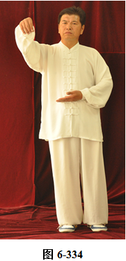 接上式,腰上提往左旋转,身体随向左转动,眼神也同时随之向左看。挤式不变,跟随身体也向左转至正南,向上方插掌,右脚随之内转,脚尖朝向正南;腰微拱,插掌的两臂顺势向下採,重心落至右腿,呈微倚式;腰向右外旋传,面侧向西北。两臂随之翻转向右后,左手掌脱离右手腕,两掌指尖斜指向地面,两掌心朝下; 左腰上提,左脚提起,向左外开,脚尖朝向正南,与左肩垂直平行。右腰同时上提向左转,两臂随向左划大平弧,摆向正南,呈左弓步; 腰随之后拱向左外撑,重心移至右腿,两臂继续划圆,随重心转移后坐,收之腹前。左手里旋翻,手心朝上,两掌心相对合在一起(见图6-329至6-336)。腰微拱旋转向右,两掌相合的右肘也随之微转, 稍斜向西北,打出右边肘;腰回转微含,随之上提,右臂顺势向右外打开,右掌变勾手,向右上方平送,略高于右肩,左手仍置胸前; 腰微拱向左外转,提左膝,左脚向左前上方迈出一大步,脚尖朝向东南。 身体随转面向东南,右脚随之内转。左腰继续上提,左臂随之掤出,成左弓步。腰微拱,身体稍后倚 将掤出左掌顺势内旋翻,掌心向下採按至腹前。腰随即上提,左掌顺势向左前上方推出。