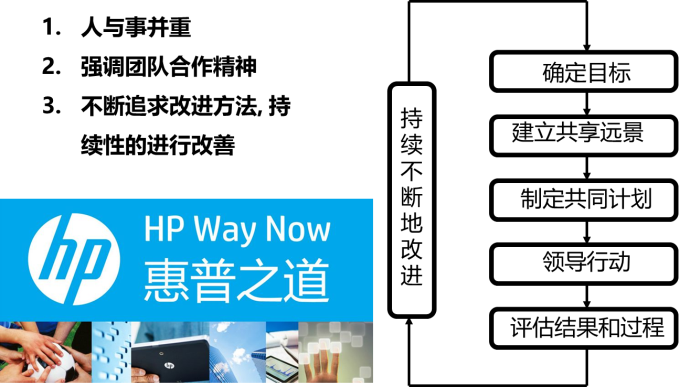 惠普公司(HP)是近几十年来全球管理水平最高的企业之一,其创始人休利特(William Redington Hewlett)和帕卡德(David Packard)推崇德鲁克思想,惠普的整体管理思路(后来被总结为惠普之道)和德鲁克的“事业理论”极为相似。美国硅谷在上世纪50年代完全是以利益和金钱驱动的怪兽,只有惠普公司特立独行,坚持以人为本的思路,有自己明确的核心价值观: