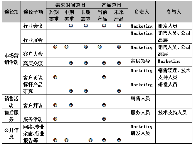通过表5-3需求收集方式,可以发现,依靠销售活动、服务活动所收集的需求是针对当前产品偏紧急性的需求,要想获得中长期需求,必须有其它需求方式相配合。