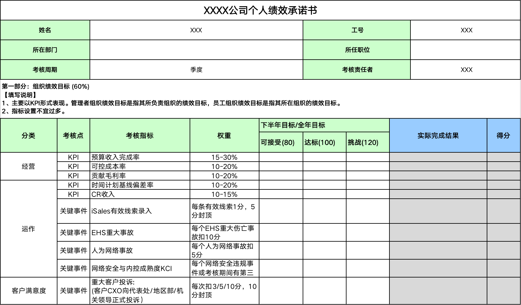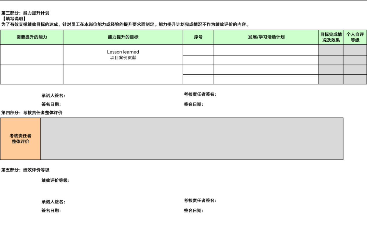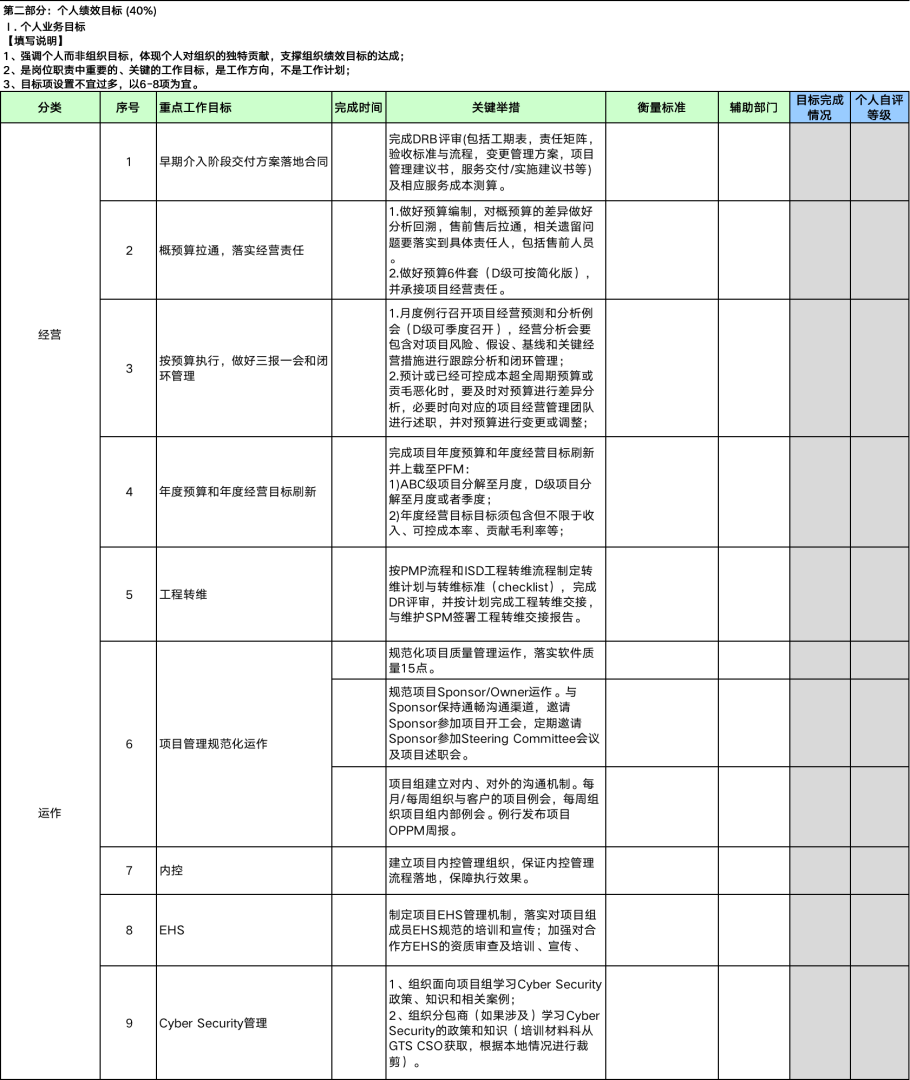 值得一提的是,因为是总经理的岗位,所以绩效合约中加入了组织绩效目标,且占比达到60%,而个人绩效目标占比40%,这在总经理的岗位上这么设置是合理的。级别越往下,原则上个人绩效目标的占比应该越高,组织绩效目标占比越低,甚至是不设。