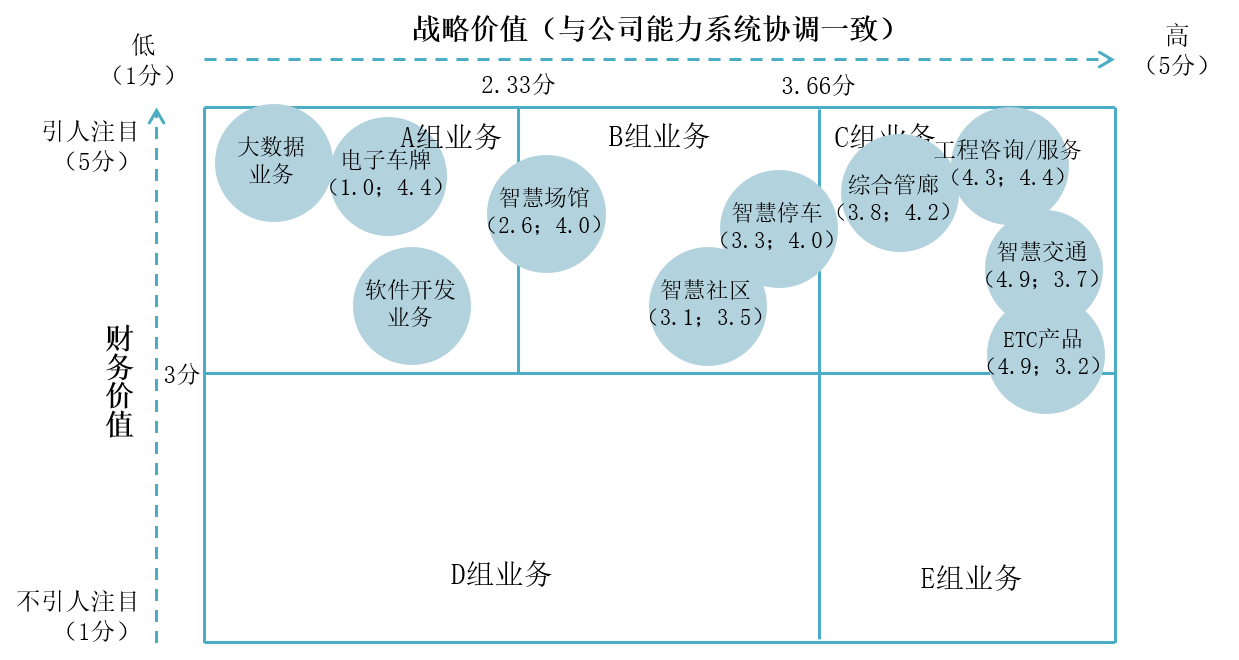 A组:“孤星业务”,能力一致性较低,但财务价值价高的业务,这里包括大数据业务、电子车牌业务、软件开发业务。