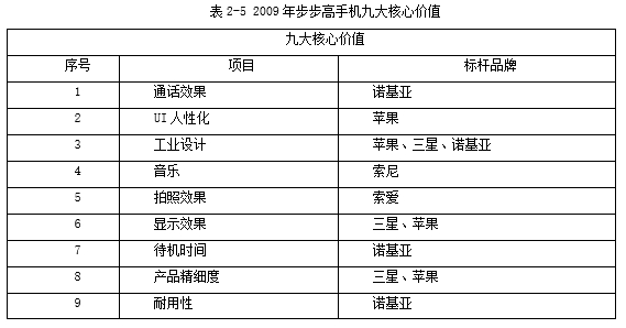 我们发现公司每一位研发工程师的桌面上都放着这样一张表格(见表2-5),即步步高手机九大核心价值,当时深感震惊。一个刚刚进入手机行业没几年的公司,一上来就直接对标苹果、三星、索爱、诺基亚这类全球最顶尖的公司,且将最顶尖企业最牛的技术优势当成每一位研发工程师学习和超越的目标。
