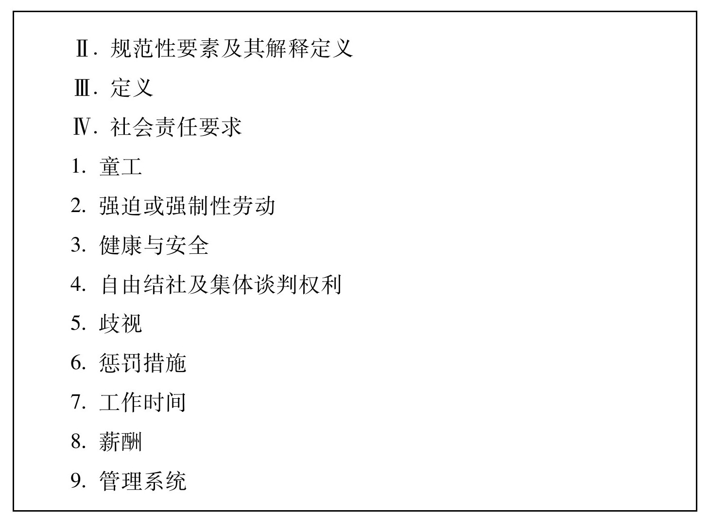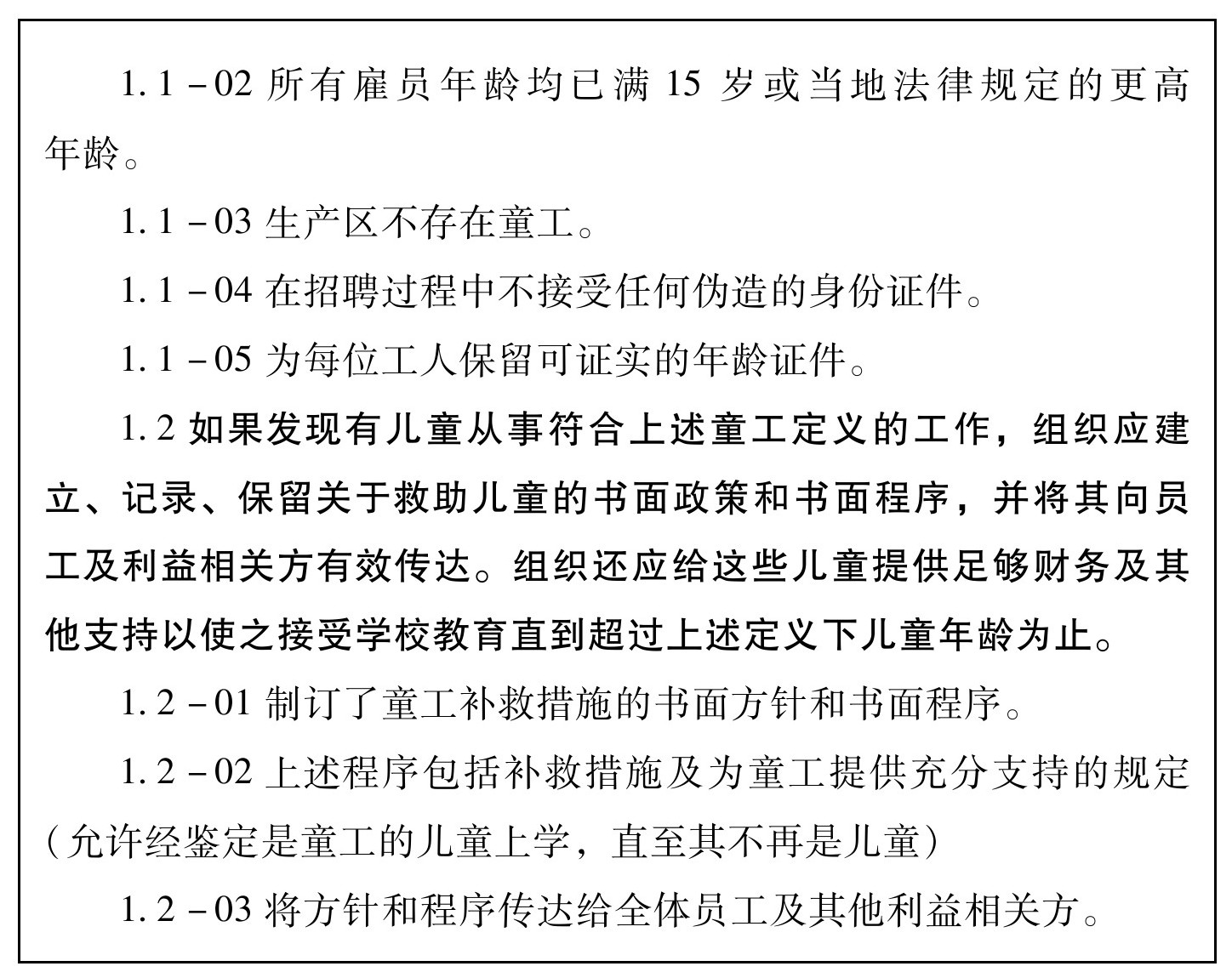 4.本标准目的在于提供一个基于联合国人权宣言,国际劳工组织(ILO)和其他国际人权惯例,劳动定额标准以及国家法律的标准,授权并保护所有在公司控制和影响范围内的生产或服务人员,包括公司自己及其供应商、分包商、分包方雇用的员工和家庭工人。