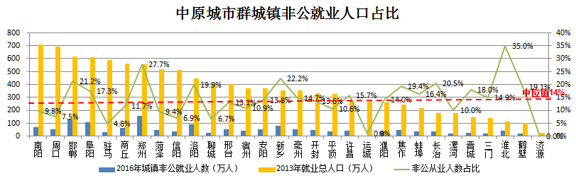 非公就业人口占比体现城市经济的活力和可持续性。 中原城市群非公就业人口占比中位值为13.9%,郑州、新乡、长治、淮北均高于20%,活力较强。