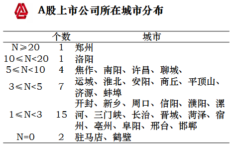 上市公司数量的多少是反映一个城市经济活力的重要指针。中原城市群A股上市公司数量相对较少,10家以上的仅有郑州和洛阳。