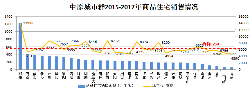 中原城市群26个城市2015-2017年三年平均土地出让住宅总建设面积为5996万平米,平均成交楼面均价为789元/㎡。