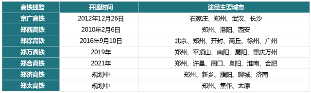 当前郑州已经开通京广、郑西和郑徐高铁,经过郑州的高铁车次533趟,通过高铁能通达的城市数超过120个,未来,郑万、郑合、郑太和郑济4条高铁线路也将陆续建设开通,“米字型”高铁网络的建成将使郑州到合肥、济南、太原、徐州等城市的时间缩短至2小时以内。同时郑州航空港区是集航空、高铁、城际铁路、地铁、高速公路于一体的综合枢纽。