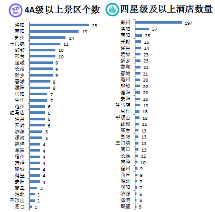中原城市群共有4A级以上景区215个,占全国4A级以上景区1335个的16.1%。四星级以上酒店693个,其中四星级以上酒店达到100家以上的城市为郑州。洛阳四星级及以上酒店数量超过50家。