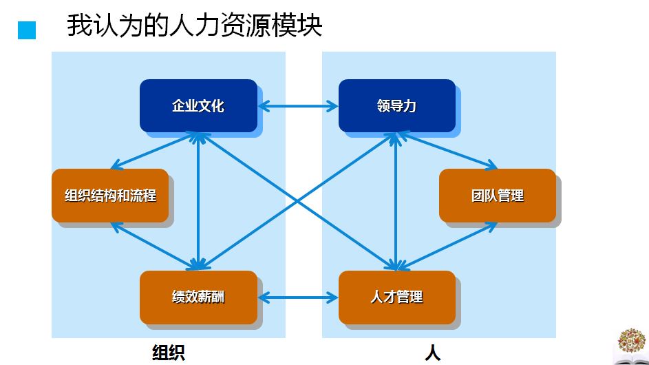 笔者认为,从OD来讲,人力资源可以分为两大块:组织和人。而过往关注的是组织,也就是组织结构、绩效薪酬,但是现在越来越多的企业开始关注人,笔者认为这是“回归人力资源的本源”。笔者认为的人力资源模块如图1-1所示。