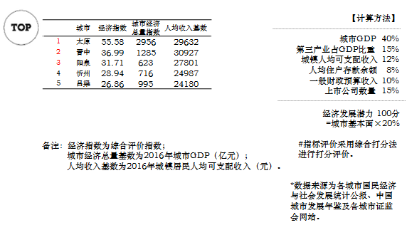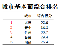 太原城市群城市基本面综合排名TOP3的城市为:太原、晋中、忻州。处在城市发展较好区、适中区、较弱区城市比例为0:1:4。