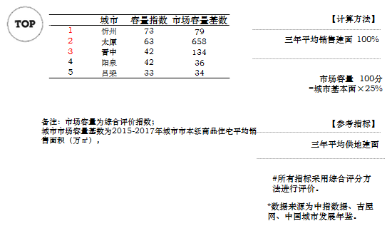 市场容量指数重点考察城市市场销售规模水平、去化周期及房企进驻,是城市房地产发展的安全边界。该指数我们从市场容量、供地面积、购买能力、房企进驻热度等层面综合研判房地产市场安全属性。