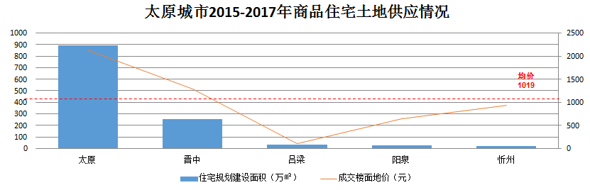 太原城市群5个城市2015-2017年三年平均土地出让住宅总建设面积为1225万平米,平均成交楼面均价为1019元/㎡。