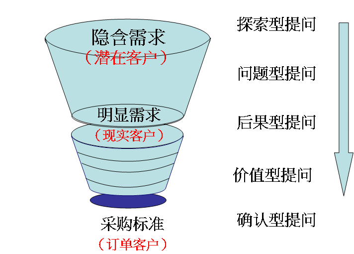 第三,客户在需求漏斗的位置(见策略性提问和需求漏斗图),与采用什么样的策略性提问方式也有很大关系。