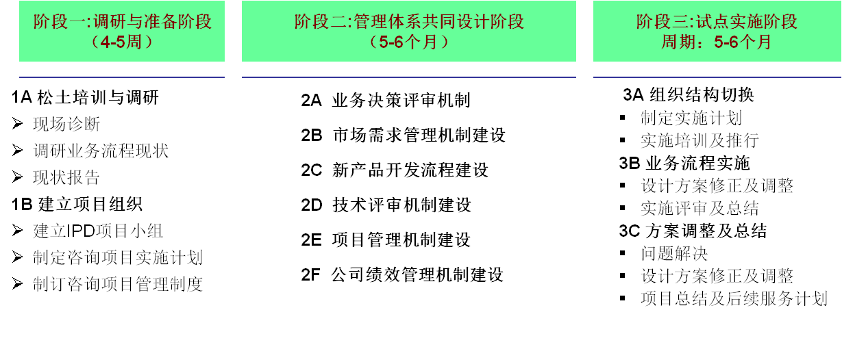 八、 IPD咨询项目遵行“先僵化,后优化,再固化”的推行原则。各部门须无条件、全面执行顾问所提供的思想、方法、工具以及流程。若项目在推行过程中遇到问题时,可由顾问在推行实践中加以调整优化。