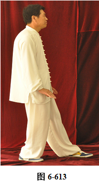 接上式,腰微拱,右腿微弯曲,重心渐渐移向右腿。腰上提向左旋转,同时左掌外旋,手心向上经右臂下向右外伸,并沿右臂向前随伸随着臂外旋,掌心翻转朝里,右拳变掌;腰下沉,随即沉肘,向胸部抽回;腰微提,随撤随臂外旋,使掌心也翻转朝里。两掌高与乳平,两臂交叉,右臂在里;腰继续拱,重心继续后移,后腿坐实;腰上提微左转,重心稍前移,两掌向左右分开,间隔一横掌的距离;腰微拱,随着两臂内旋,使掌心翻转朝下,收至小腹前,重心移落右腿,上身后倚,成下按式;两腰上提走弧形,重心前移左腿。两臂随之上抬向前掤,两掌向前按出,掌心向前,高与额头略平,成左弓步,眼神向前方远视(见图6-612至6-614)。