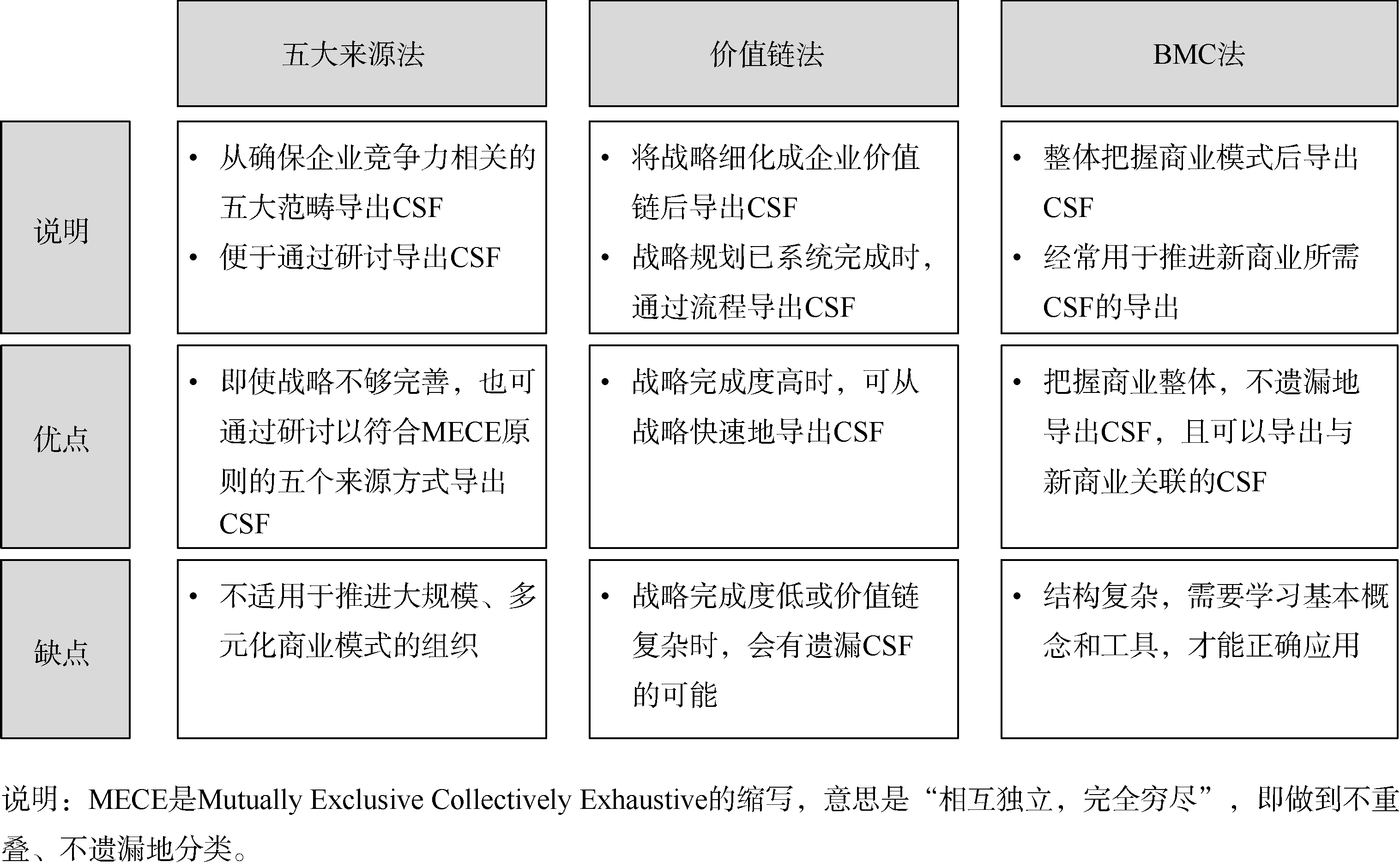 CSF 自 20 世纪学者 Daniel 提出后便引起大家的关注,后由麻省理工学院的 John Rockart(1979)引入信息系统研究领域,用于分析高层管理者的信息需求。一直以来,无论是学者还是管理实践者,都很重视其实际应用,并在长期的实践中总结出三种导出方法,分别为五大来源法、价值链法和商业模式画布(Business Model Canvas,BMC)法。下面我们逐个做介绍。