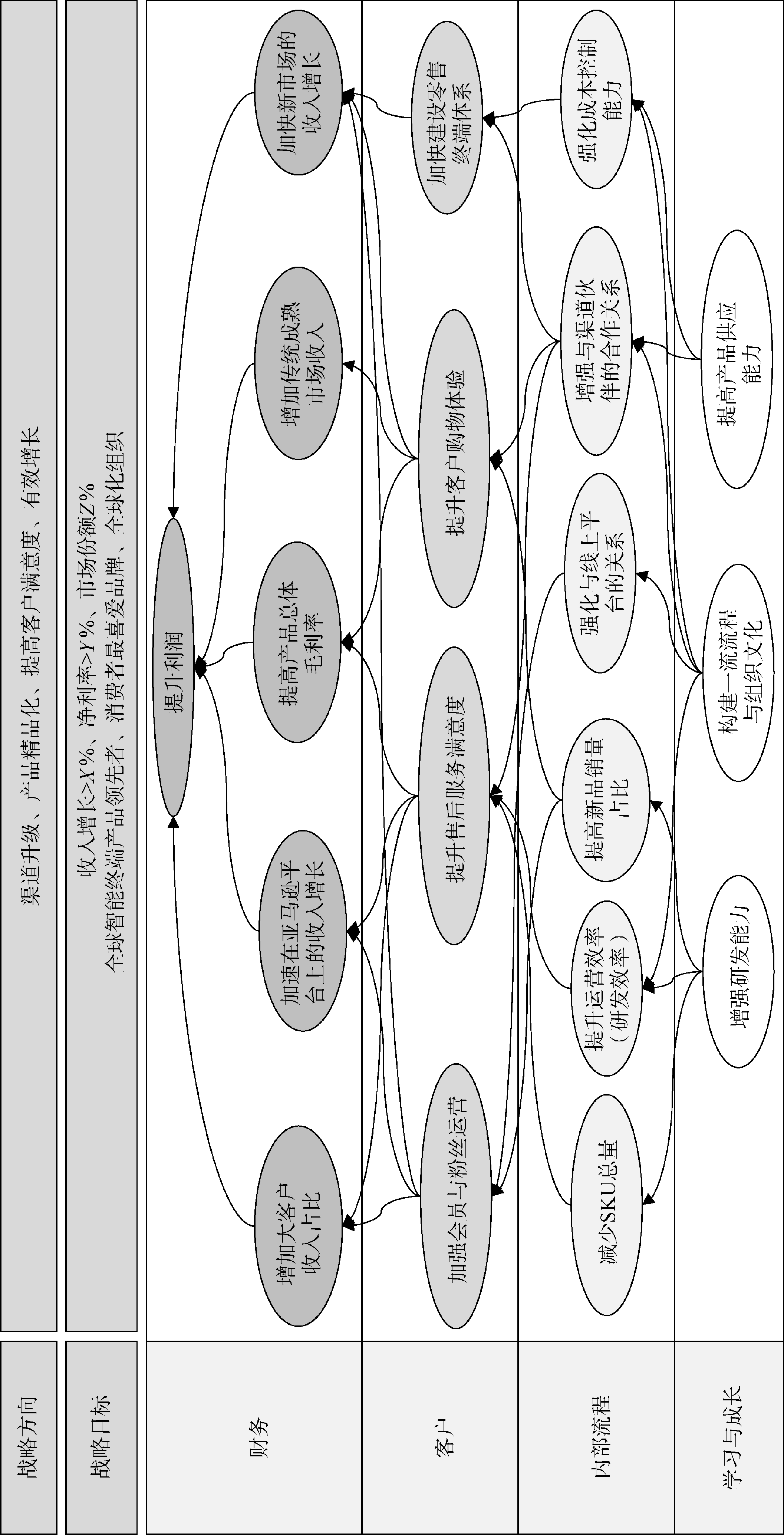 BSC 检验通过各个维度之间的因果关系,识别是否有缺失的 CSF,同时从四个维度检验 CSF 之间的均衡性。如果各个 CSF 之间没有办法建立因果关系,则意味着战略目标的实现存在风险,需要识别并补充缺失的 CSF。CSF 选定后,后续同样需遵循 BSC 的维度均衡选定 KPI。基于表 2-6 导出的 CSF,我们来做一个检验,如图 2-12 所示。