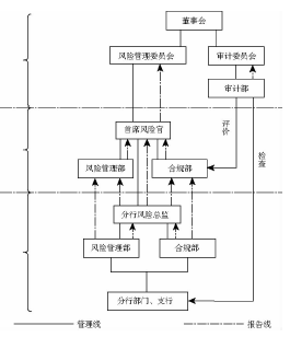 在管理层方面,由总行及各级分支行下设的风险管理部门对相应管辖范围内的风险问题进行管理。该部门由相应层级的风险管理人员如“分行风险总监”等独立领导,在风险管理方面不受经营管理机构的制约。例如,总行下设的风险管理部和合规部由首席风险官领导,对风险政策制定、计量分析、信贷审批、监督控制等工作进行全面统筹与管理。分行下设的风险管理部和合规部由分行风险总监领导,在经营管理的组织机构中相当于副行长。值得注意的是,他受到总行风险管理部门更直接的领导。实际上,某些银行为突出风险管理的独立性和重要性,将该级职务名称确定为“风险总监兼副行长”。其职责主要是带领分行风险管理部门,组织和推动分行及所辖机构的风险管理工作。最后,在风险管理架构的末端,由一线风险经理将风险管理的触角延伸至每个授信客户。当然,他们在风险管理架构中服从分支行乃至总行风险管理部门的领导。在整个架构中,风险管理人员可参与业务经营的整个过程,并与业务部门共同承担风险责任。