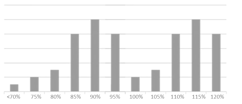 配额完成出现双峰(如图16-4所示)或多峰分布时,每一个“峰”代表一个特定销售人群,如新销售人员、某区域销售人员等。双峰或多峰分布,可能意味着销售管理缺少一致性或区域设计不合理。双峰或多峰分布,对销售薪酬不是一个好征兆。特别是出现两头高中间低的倒钟形曲线时,通常意味着销售业绩主要由能够超额完成任务的优秀销售人员完成,企业正在付出高昂的薪酬成本。同时,无法完成业绩的大部分销售人员将带来高流动率。