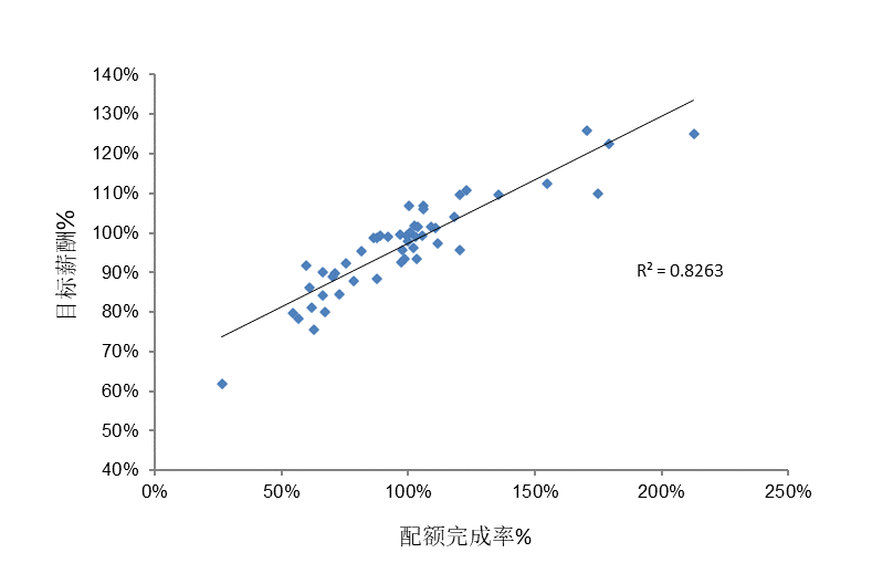 设计良好的销售薪酬激励计划驱动销售人员提升绩效,同时增加销售人员的收入。我们可以通过分析销售业绩与销售薪酬之间的相关性来评估计划的有效性。我们通过Excel等计算机软件,完成销售业绩和销售薪酬的相关性分析。进行相关性分析时,我们可以获得R2的值。通常,当R²大于0.8时,销售业绩与销售薪酬之间存在很强的相关性,可以认为计划是有效的,无需进行调整。当R²位于0.6~0.8时,销售业绩与销售薪酬之间存在一定的相关性,计划存在改进的空间。当R²小于0.6时,我们认为绩效与薪酬之间的关联很弱,计划可能需要重新审视和设计。图16-6的绩效与激励薪酬相关分析示例中,我们可以观察到销售人员的配额完成和目标薪酬之间有着很强的相关性。可以判断,这个销售薪酬激励计划是有效的。