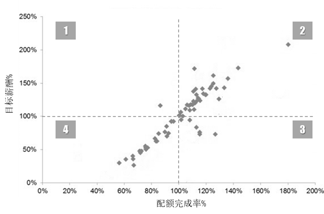 获得相关性分析散点图后,我们可以通过设置象限做进一步分析。如图16-7所示,象限一为低绩效高收入的销售人员,象限二为高绩效高收入的销售人员,象限三为高绩效低收入的销售人员,象限四为低绩效低收入的销售人员。显然,象限一那位仅完成约90%的销售业绩却获得近120%的目标薪酬的销售人员,以及象限三那些超额完成指标但并未获得相应收入的销售人员需要关注。销售管理层需要进一步分析,找出背后的原因。