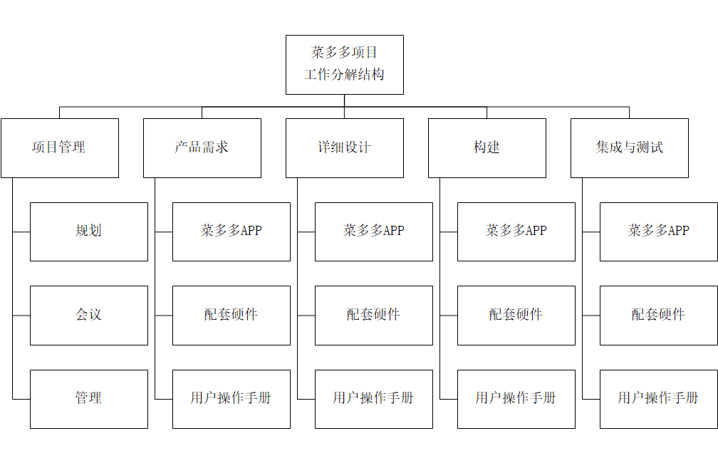 工作分解结构是制定进度计划、资源需求、成本预算、风险管理计划和采购管理计划等的重要基础。工作分解结构包含产品范围和项目范围。所以,菜多多项目工作分解结构除了包含各种技术工作、主要可交付物,还包含项目管理工作。如果有外包工作,也应该纳入WBS中。创建WBS常采用自上而下的方法,以项目主要可交付物或者项目生命周期各阶段作为分解的第二层。如图8-12、图8-13所示。