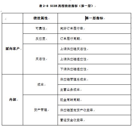 从可靠性、反应度、灵活性、成本、资产管理五个维度给出了第一层绩效测量指标,如表2-8所示。