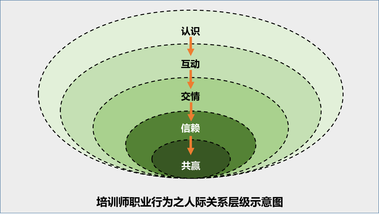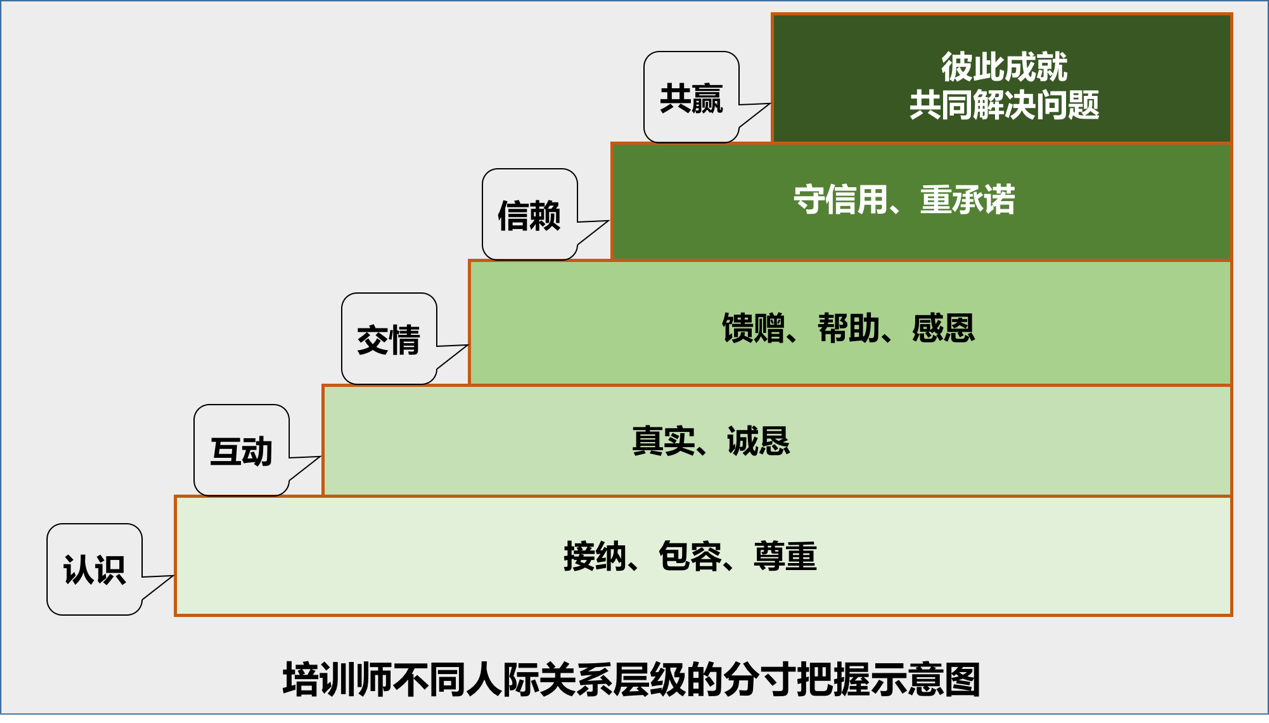 作者认为在培训师的职业行为中,与互动对象的人际关系层级可以分为认识、互动、交情、信赖及共赢五个层级。不同的人际关系层级,彼此互动的强度和深度是完全不同的,这就是所谓的分寸有度,也就是我们常说的“分寸感”。