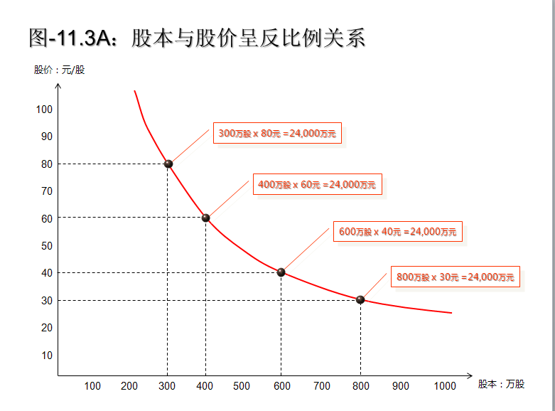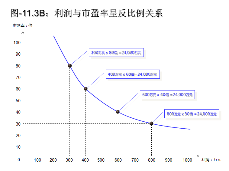 由上述公式可见,企业的市值分别取决于于四个最主要的变量:股价、股本、利润、市盈率。在这四个变量中,股价与股本、利润与市盈率分别呈反比例关系。所谓反比例关系就好比跷跷板,此消彼长。但是你同样会发现,企业的市值与这四个变量都呈正比例关系,也就是说它们其中任何一个变量的涨跌,都会引起企业市值的同向涨跌。