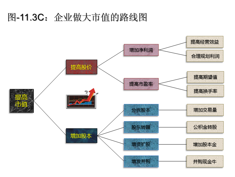 第二是增扩股本。增扩股本的方法有四种,第一种是分拆股本,把一股拆成两股或者拆成十股;第二种是老股东转赠股本,例如每十股转赠五股,不过转赠股权需要动用资本公积,等于用给股东送股的方法代替分红;第三种方法是定向增发融资;第四种方法是定向增发并购。后两种方法都属于增资扩股,只不过前者是用增发的股票置换现金,后者是用增发的股票置换资产。增扩股本虽然难免在除权之后拉低股价,但是股价降低会促进交易的活跃,增加股权的流动性,从而间接推动市值提升。