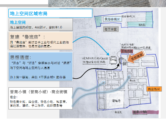 地上:营造地道的“平遥味道”、“山西味道”、“晋商味道”、“工业味道”——城中城。