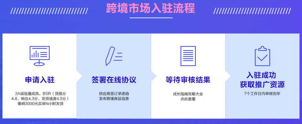 4)跨境专供入驻流程。跨境专供入驻和其他工具入驻的条件差不多,分为四步。如图9-28所示。